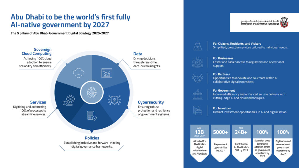 The Abu Dhabi Government has announced the “Abu Dhabi Government Digital Strategy 2025-2027,” advancing the emirate’s transformation towards an AI-powered government. Implemented by the Department of Government Enablement – Abu Dhabi (DGE) in collaboration with Abu Dhabi government entities, the strategy aims to position the emirate as a global leader in AI-driven government and will allocate AED13 billion through 2025-2027to foster innovation and technology adoption in the emirate.
